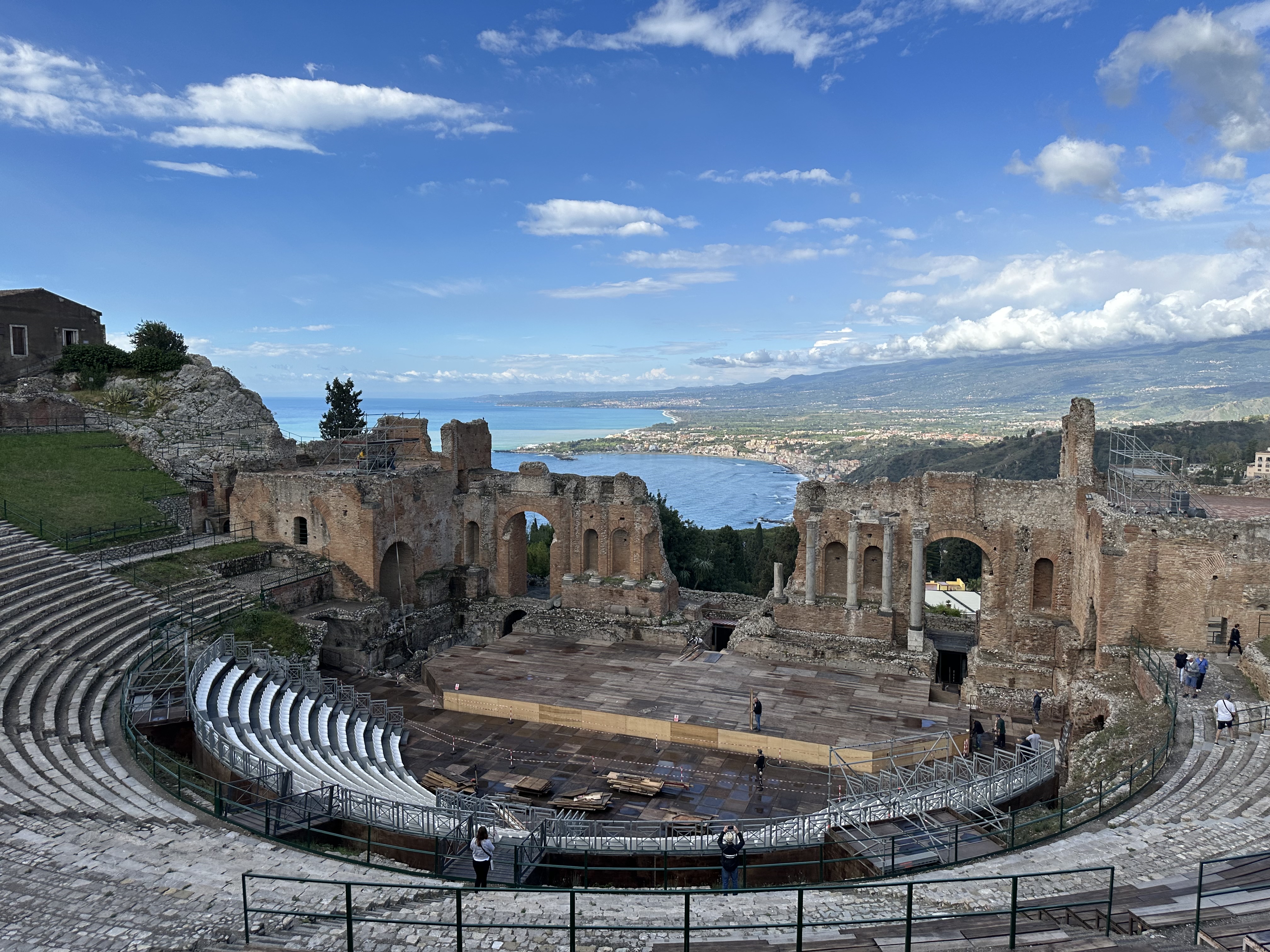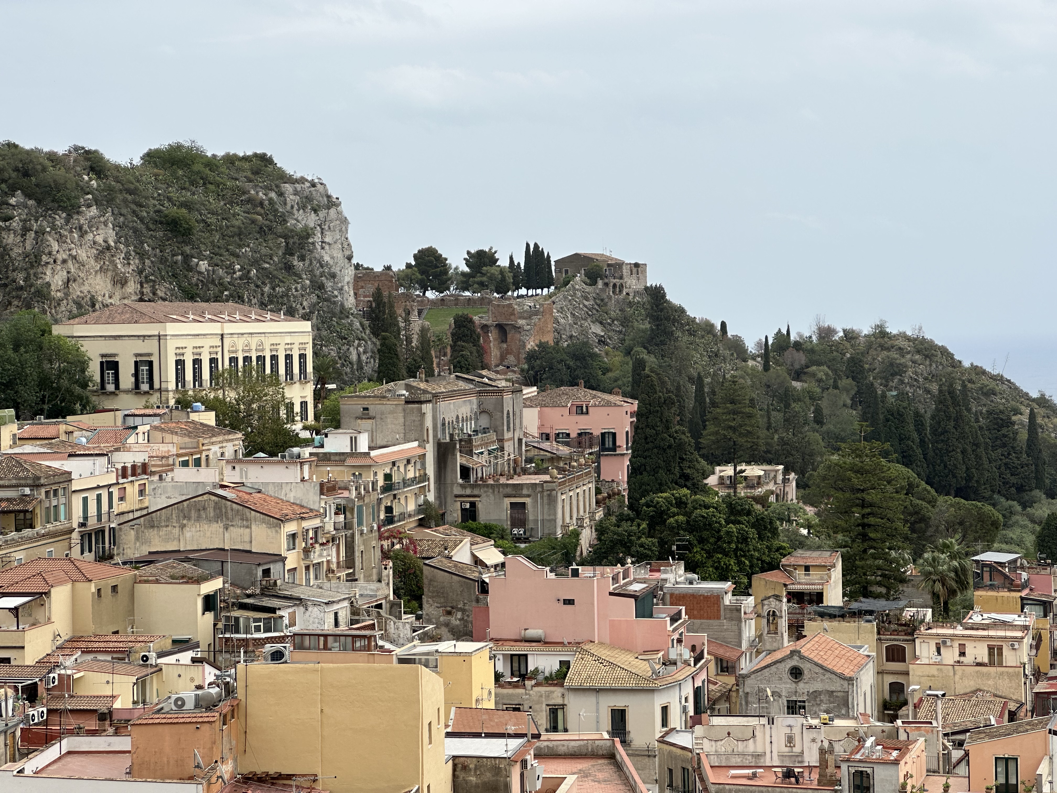 That afternoon, Ian and Carmel decided to climb the 541 steps up to the fort on top of the mountain above Taormina. Lidia and I decided to give that a miss and wandered around the old town, enjoying a traditional arancini ball from a place recommended by our concierge. We then walked along the main street to the end, stopping at the two piazzas that have panoramic views over the coast. We saw the hotel that was used to film season two of “The White Lotus”, which apparently has been booked out for months in advance by U.S. citizens who are crazy about the show. It is so popular that you have to book the restaurant 4 months in advance, and even going there for a cocktail in the bar requires a booking.