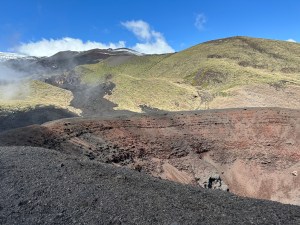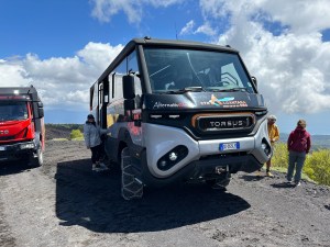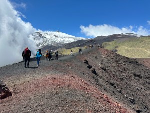 It was then time to drive up the side of the great volcano herself. We stopped at a certain point and changed vehicles to a giant four-wheel drive bus, which took us up to 3,900 metres above sea level. We got out of the vehicle and hiked up the slope to one of the 300 craters that surround the summit. Mt Etna is so huge, that when it erupts, lava blows from a line of about 25 craters in a row. We drove right up to the peak, where it was covered in snow. Fortunately, there were no eruptions the day we were there!