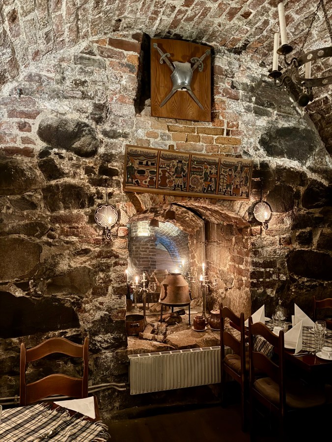 We were due to go on a museum tour at 6:00 so we stopped into a small restaurant recommended to us for an early dinner. The owner, Gianni was very friendly and accommodating, and even though the cellar was closed to diners, he was more than happy to let us dine down there. The building was built 700 years ago in medieval times and the cellar hasn’t changed since. Candles on the tables lit the suit of armour and medieval artefacts, and a tunnel used to escape to the church led off the room. The menu contained roast reindeer, but we opted for the Swedish meatballs, which were delicious and paired very well with Swedish beer on tap. The meatballs were served with mashed potato and lingonberry, which is a small, sour red berry. Paired with the meatballs and gravy, they worked really well.